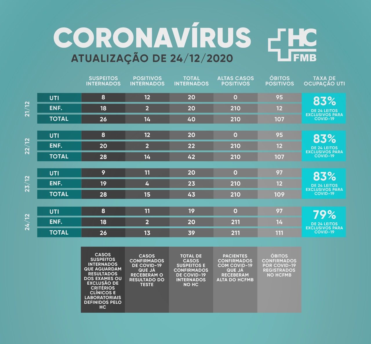 O Hospital das Clínicas da Faculdade de Medicina de Botucatu (HCFMB) atualizou suas principais informações referentes à COVID-19 desta quarta-feira, 24 de dezembro.