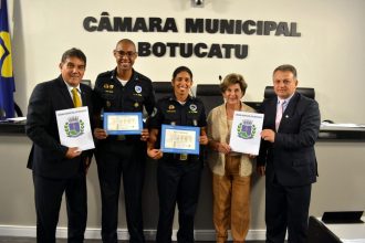 Os Guardas Municipais Cintia Ribeiro e Thiago Belo foram homenageados na última segunda-feira, dia 15, com uma Moção de Congratulações apresentada em Sessão Ordinária e assinada em conjunto pelos vereadores Sargento Laudo [PP] e Jamila [PSDB]. O documento foi entregue durante a sessão ordinária dos vereadores.