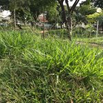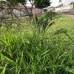 Na rua e na calçada os cacos de vidro evidenciam a situação e impedem que pais circulem com tranquilidade com seus filhos no local. O mato alto e a falta de conservação também contribuem para o cenário hostil.