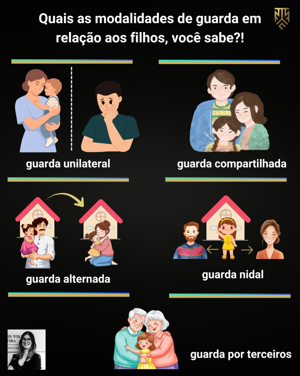Por essa razão, vamos tratar de forma breve quais são os tipos de guarda que se dividem em guarda unilateral, guarda alternada, guarda compartilhada, entre outras: