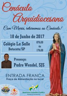 No próximo domingo (18), a Renovação Carismática Católica da Arquidiocese de Botucatu promove o Cenáculo Arquidiocesano a partir das 07h30, no auditório do Colégio La Salle, em Botucatu, com o tema “Com Maria, retornemos ao Cenáculo!”.