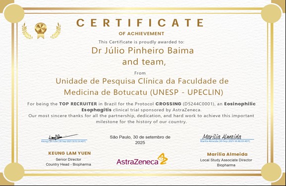 A UPECLIN foi reconhecida como Top Recruiter no Brasil pelo desempenho excepcional no recrutamento de participantes para o Protocolo CROSSING, um estudo clínico de Fase III, randomizado e duplo-cego, que avalia a eficácia e segurança do Tezepelumabe no tratamento da Esofagite Eosinofílica (EoE). O estudo é patrocinado pela AstraZeneca, conduzido pelo Dr. Júlio Pinheiro Baima, médico gastroenterologista do HC-FMB, e conta com coordenação local de André Luís Bertani, responsável pela pesquisa na UPECLIN.
