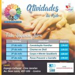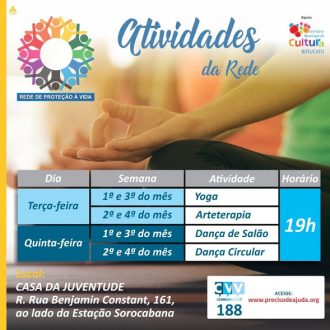 Já as terças e quintas-feiras serão desenvolvidas aulas de yoga, arterapia e dança na Casa da Juventude, sempre a partir das 19 horas. Às quartas-feiras, às 18h30, serão realizadas Rodas de Escuta, na ACE/CDL, e aos domingos, às 9 horas, dança circular no Parque Municipal. Todas as atividades são gratuitas e não necessitam de inscrição prévia.