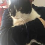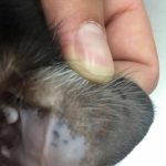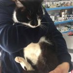 Ela é mansa e tem uma identificação na orelha que está ilegível, indicando que ela foi castrada em nome de alguém.