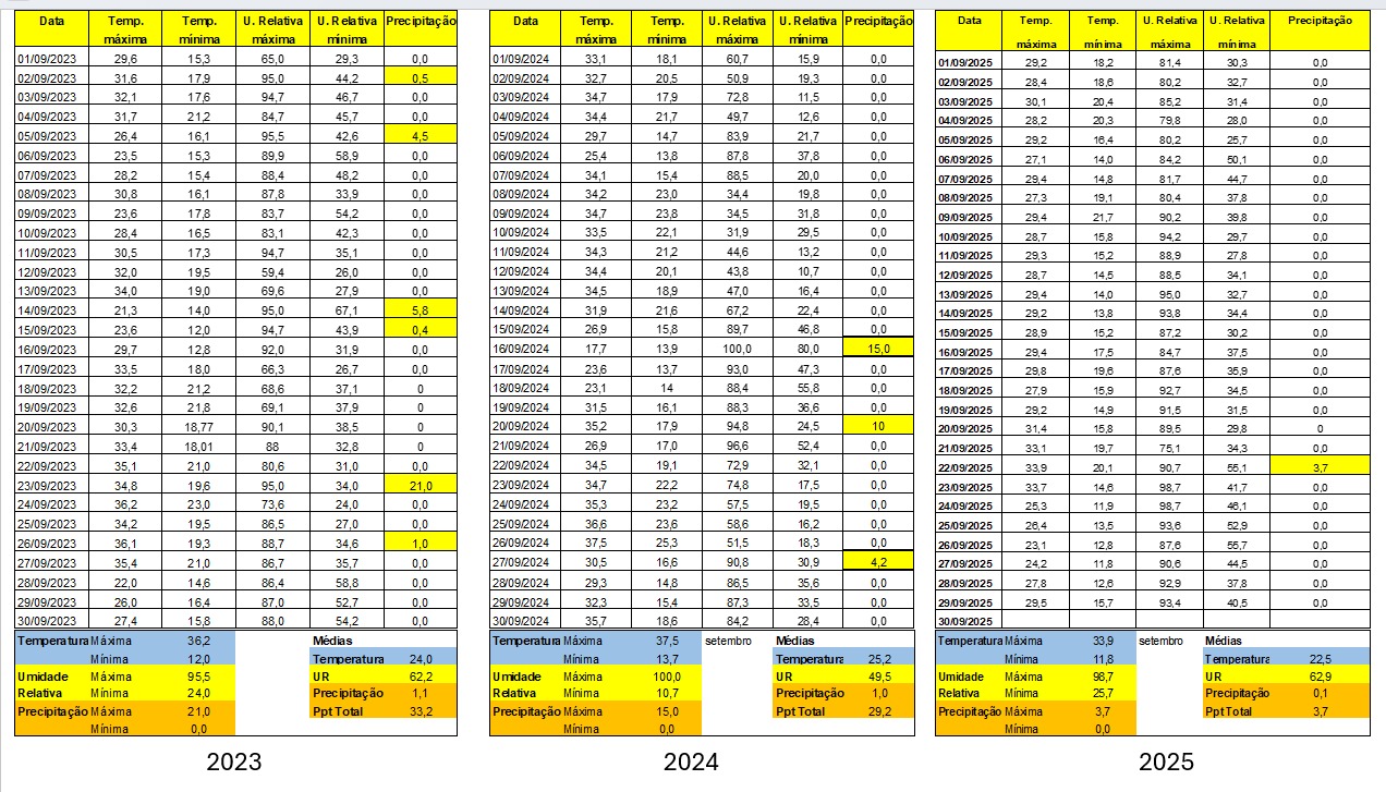 Além da estiagem, as temperaturas chamaram atenção. A máxima chegou a 33,9°C, enquanto a mínima foi de 11,8°C, mostrando grande amplitude térmica. Mesmo assim, 2025 teve médias mais amenas em relação a anos anteriores — setembro de 2024, por exemplo, marcou máxima de 37,5°C.