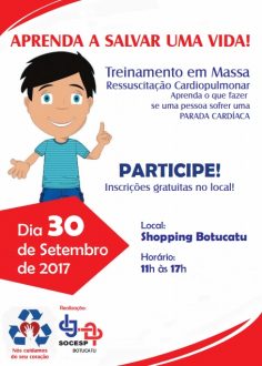 Para celebrar o “Dia Mundial do Coração”, a ser comemorado nesta sexta-feira, 29, o Shopping Botucatu promoverá neste sábado, 30, das 11 às 17 horas, ações de saúde. Haverá aferição de pressão, treinamento de reanimação pulmonar e distribuição de cartilhas sobre a prevenção de doenças cardiovasculares, em parceria com a Sociedade de Cardiologia do Estado de São Paulo (SOCESP) de Botucatu.
