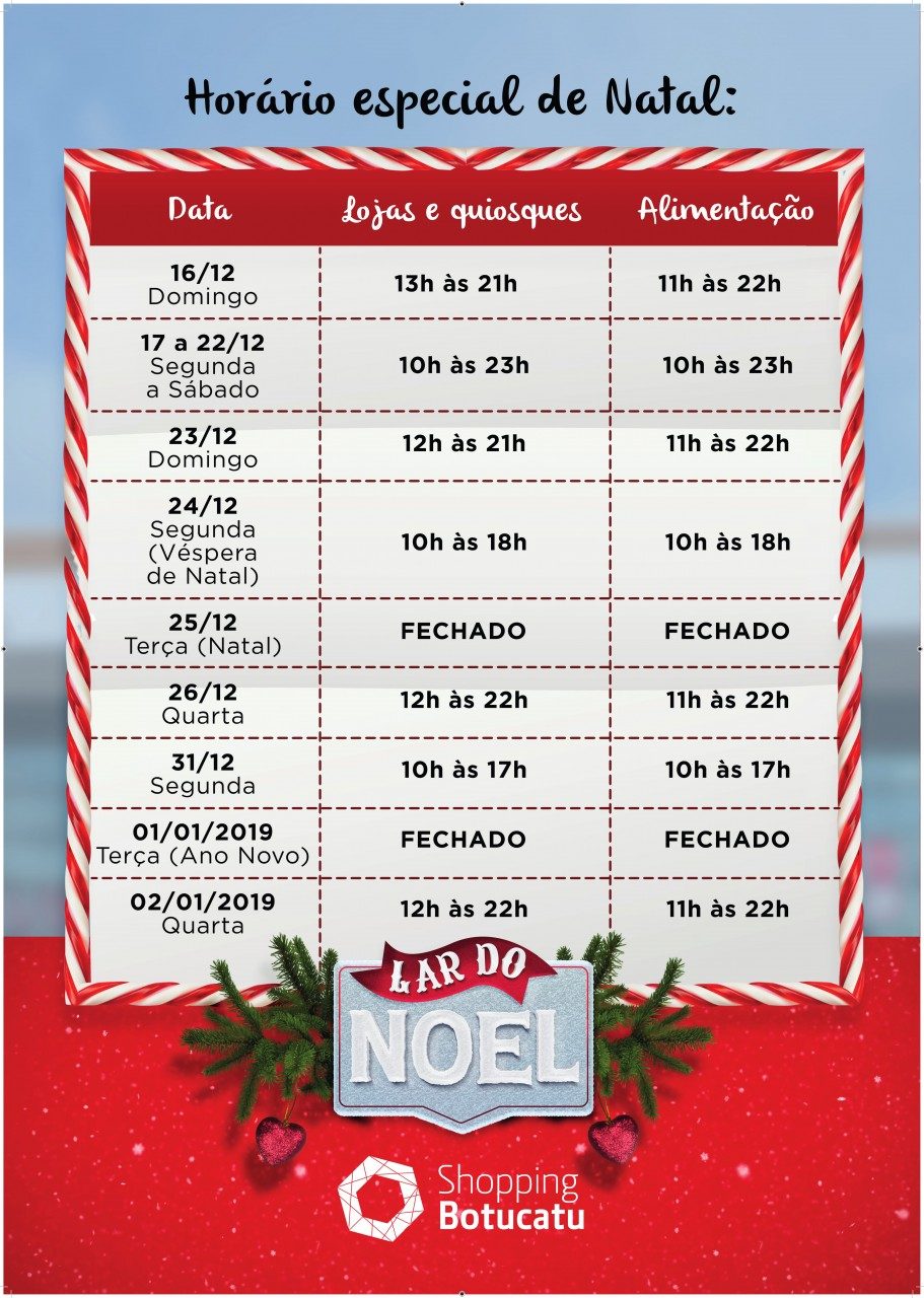 Dia 24/12 (véspera de Natal) – Lojas e quiosques – 10h às 18h; Praça de alimentação: 10h às 18h;