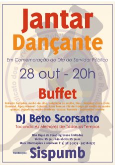Visando o bem-estar e a integração dos colaboradores da Prefeitura, o sindicato dos Servidores Públicos Municipais de Botucatu (Sispumb) realiza o 2° Jantar Dançante em comemoração ao dia da categoria. O evento será no próximo dia 28 de outubro, a partir das 20 horas, na sede da entidade.