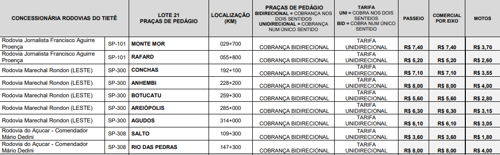 Confira abaixo tabela com as tarifas que serão reajustadas nas nove praças de pedágio da Rodovias do Tietê.