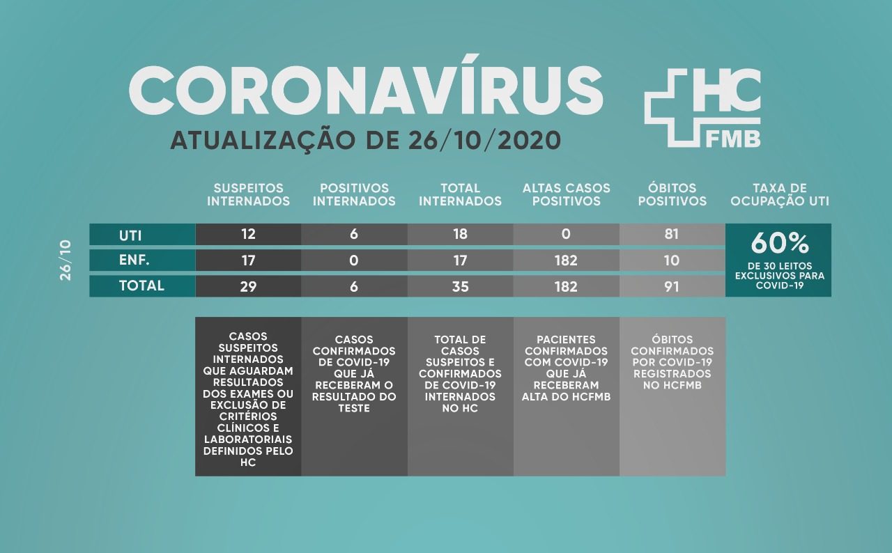 O Hospital das Clínicas da Faculdade de Medicina de Botucatu (HCFMB) atualizou suas principais informações referentes a COVID-19 desta segunda-feira, 26 de outubro.