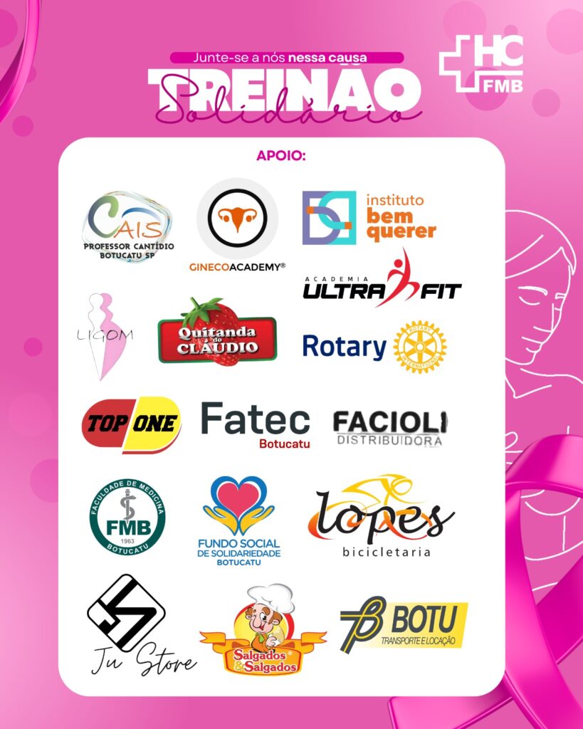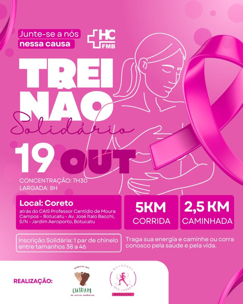 No dia 19 de outubro, os projetos “Mulheres que Correm” e “Mulheres que Cuidam de Outras Mulheres”, em parceria com o Serviço de Radioterapia do Hospital das Clínicas da Faculdade de Medicina de Botucatu – Unesp (HCFMB), promoverão um Treinão Solidário em alusão ao Outubro Rosa, movimento que reforça a conscientização sobre a prevenção e o diagnóstico precoce do câncer de mama.