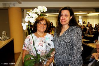 3) Entrega de ramalhete de flores para a filha Camila Saad Hossne Ganzales (à direita), que, muito emocionada em toda a cerimônia, fez breve discursos agradecendo a homenagem prestada pela Universidade em seu principal colegiado.