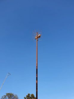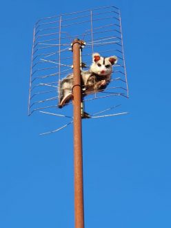 O marsupial escalou uma antena de TV de residência para fugir dos cães que estavam incomodados com sua presença. A equipe da VAS promoveu o resgate seguro do gambá “antenado”.