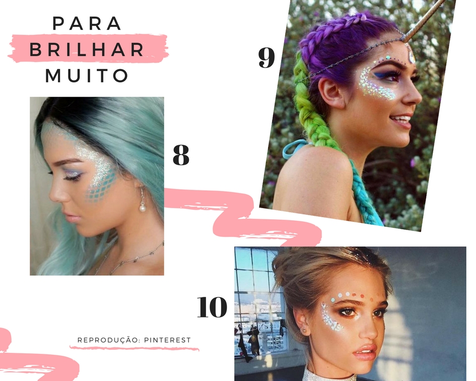 No post de hoje eu trouxe 10 modelos para inspirar a aplicação de glitter nesse carnaval. Começamos com as aplicações mais simples e terminamos com as mais elaboradas. Enumeirei as imagens para facilitar na explicação. Bora ver?