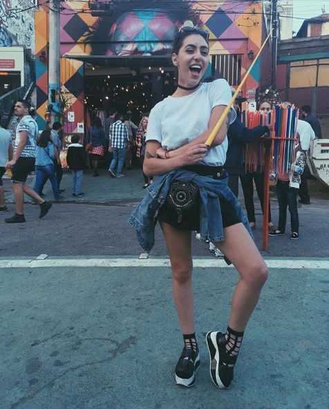 4 – Nesse look a pochete é usada de maneira bem mais divertida. O modelo é engraçadinho, ficou um charme combinado com as cores vibrantes do óculos e do tênis.