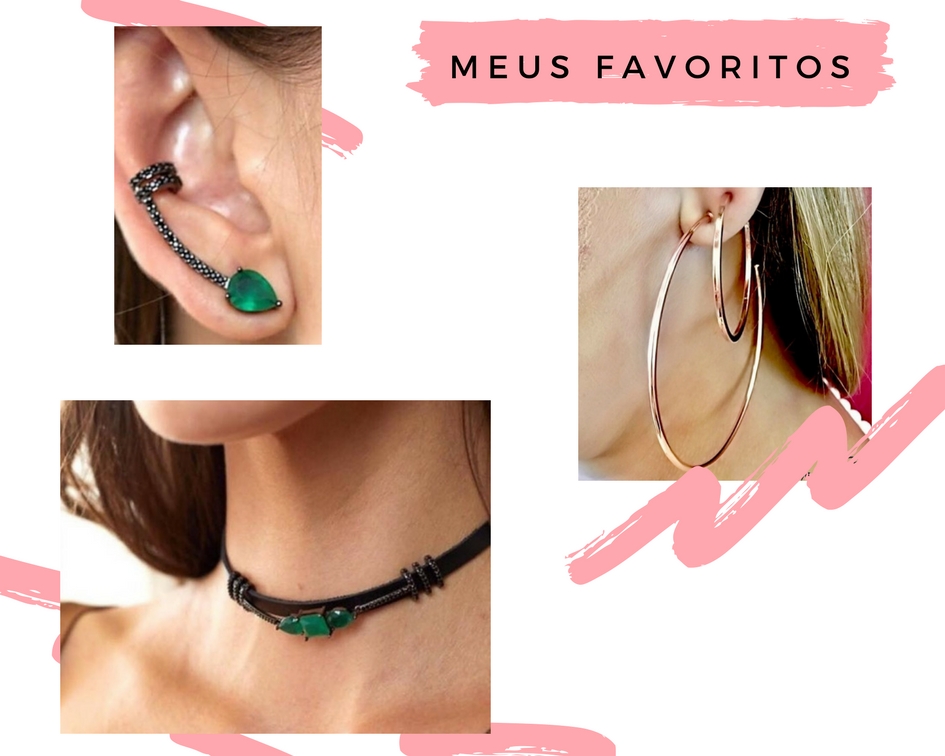 Os meus favoritos são essas argolas (uma maior no primeiro furo e outra menor no segundo) e o conjunto de brincos + choker em ródio negro.