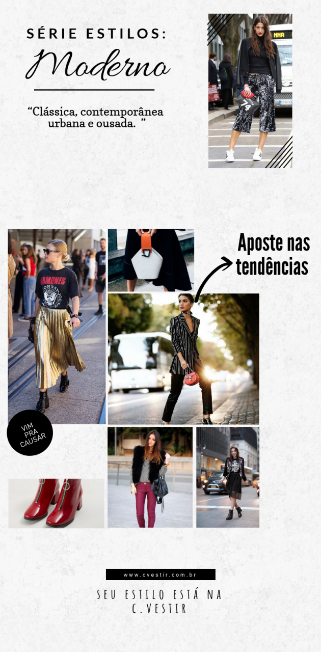 Seguindo com nossa série “ESTILOS” hoje vamos falar um pouquinho do estilo moderno, que nada mais é que uma releitura do estilo elegante ( já que se abusa da alfaiataria e cortes retos) só que com uma pitada de ousadia.