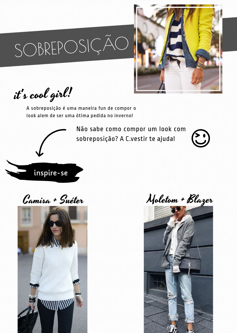 A sobreposição nada mais é o que a própria palavra diz, colocar uma peça sobre a outra, quando colocamos uma jaqueta já estamos usando a sobreposição, mas podemos ir mais além e utilizar uma camiseta por baixo de um vestido, uma camisa jeans com cardigã, e fazer várias composições muito bacanas! vamos dar uma olhada!?