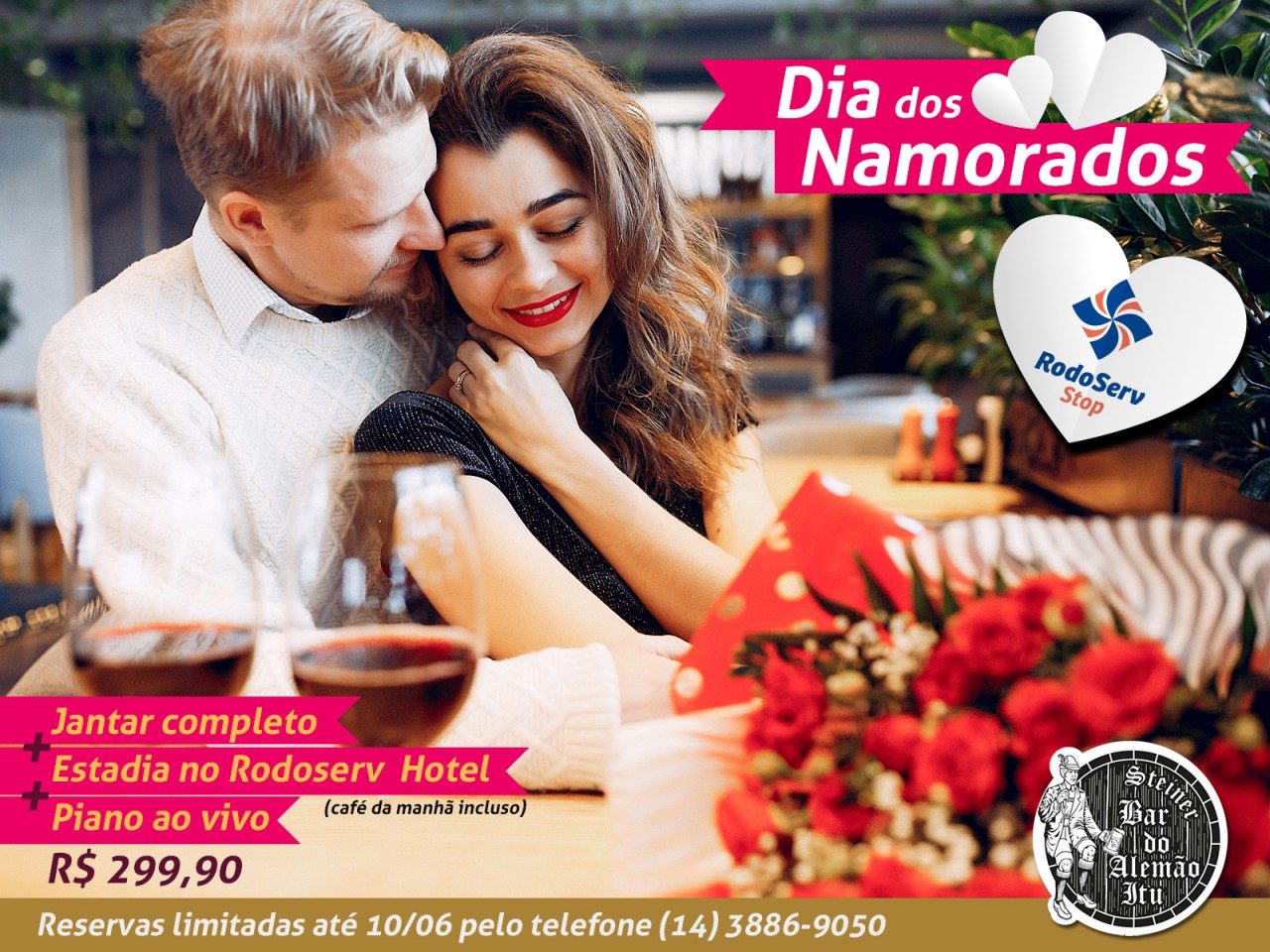 Pacote completo com jantar no dia 12, a partir das 19h30, com entrada + prato principal + sobremesa + garrafa de vinho (ou suco de uva) por apenas R$ 139,90 o casal. O pacote com o jantar completo + a estadia no Rodoserv Hotel (entrada 12/06: 18h / saída 13/06: 12h) com café da manhã incluso, por apenas R$ 299,90. Reservas antecipadas até 10/06 pelo telefone 14 3886-9050. O Rodoserv Stop (Bar do Alemão de Itu) fica na rodovia Castello Branco, km 193.