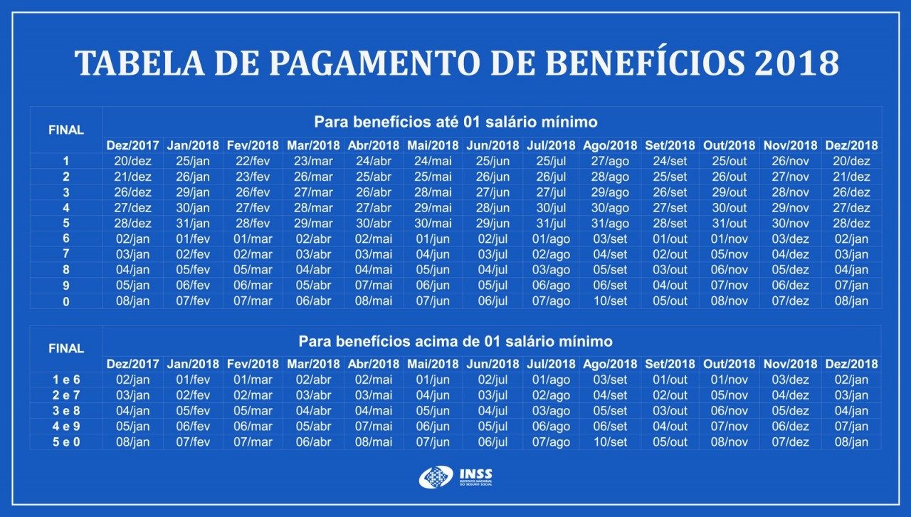Pelo calendário do INSS, os primeiros a terem o valor depositado serão os segurados que recebem até um salário mínimo e possuem cartão com final 1, desconsiderando-se o dígito. Quem ganha acima do mínimo começa a receber a partir do dia 3 de dezembro. Veja abaixo a Tabela de Pagamentos de Benefícios 2018 abaixo: