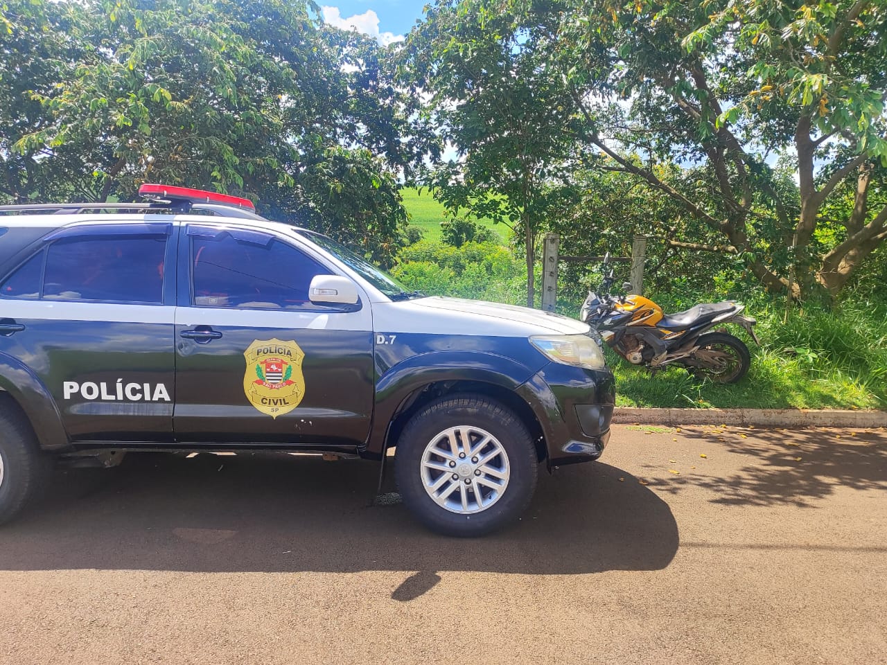 A motocicleta foi apresentada na unidade policial para a realização dos procedimentos legais. As investigações seguem em andamento com o objetivo de identificar e responsabilizar os autores do crime.