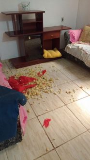 Não contentes, estouraram também tanto o gatil como o canil que ela mantém para seus animais. Ela não mora no imóvel, mas mantém a casa para dar estrutura e abrigo, pois é cuidadora de animais. Por sorte não levaram nenhum, mas os 3 cães e 5 gatos estavam bastante assustados e espalhados pela casa.