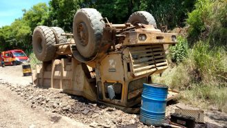 O Corpo de Bombeiros de Botucatu atendeu a uma ocorrência na tarde desta terça-feira, 21, em uma pedreira na vicinal Alcides Soares, onde o condutor de um Caminhão Randon, utilizado na extração de pedras, perdeu o controle do equipamento e tombou, ficando com as rodas para cima.
