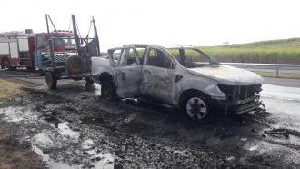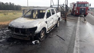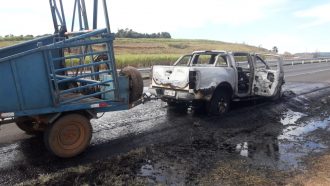 Uma caminhonete Ford Ranger ficou totalmente destruída com as chamas. O veículo puxava uma pequena carreta para transporte de animais, mas o espaço estava vazio.
