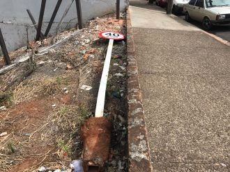 As câmeras de segurança de um estabelecimento comercial na Avenida Santana registraram uma colisão entre uma uma caminhonete e um poste de sinalização (veja o vídeo acima). Um homem estaciona uma caminhonete sentido Centro. Segundos depois o veículo desce e se choca contra o poste.