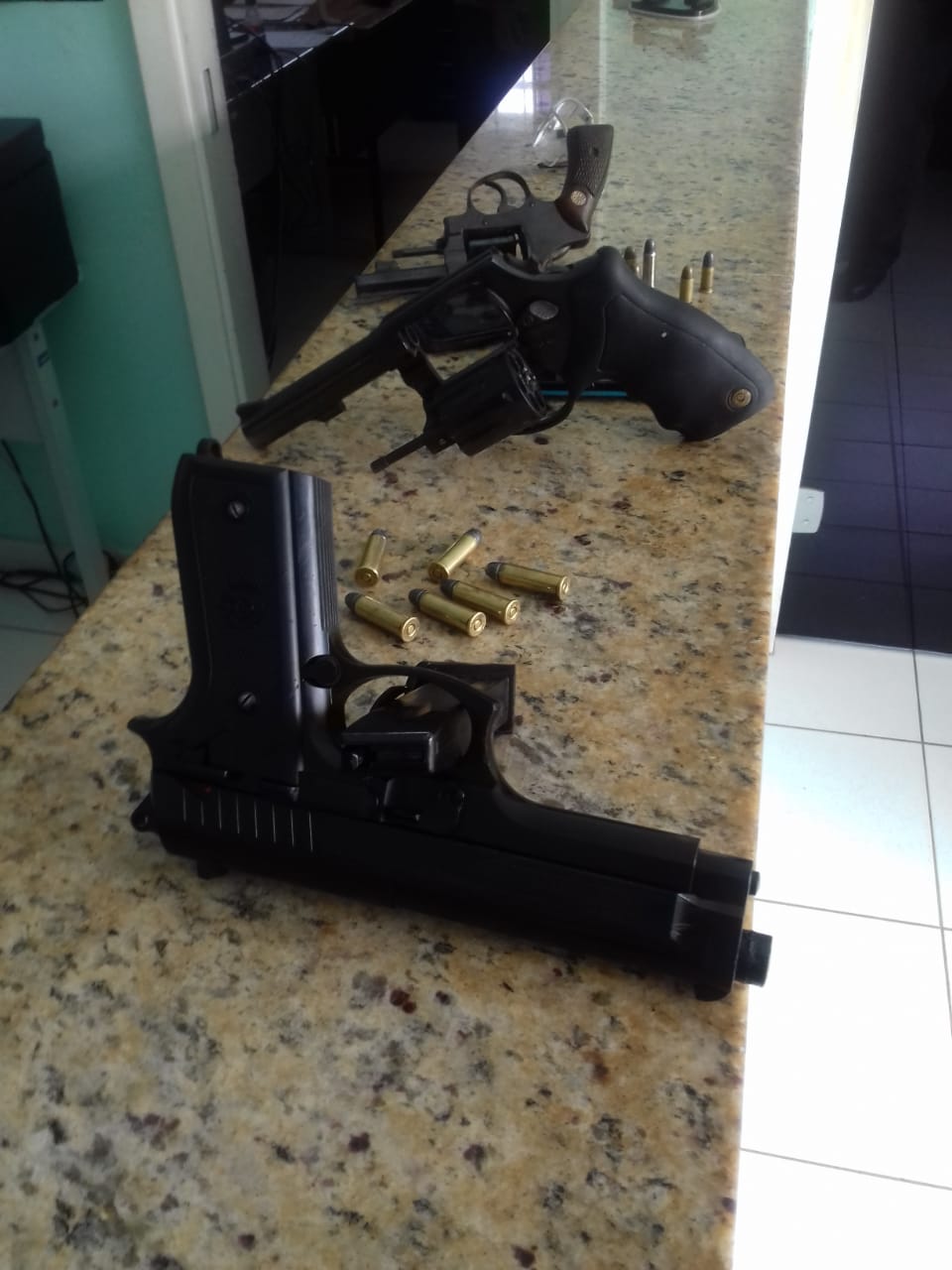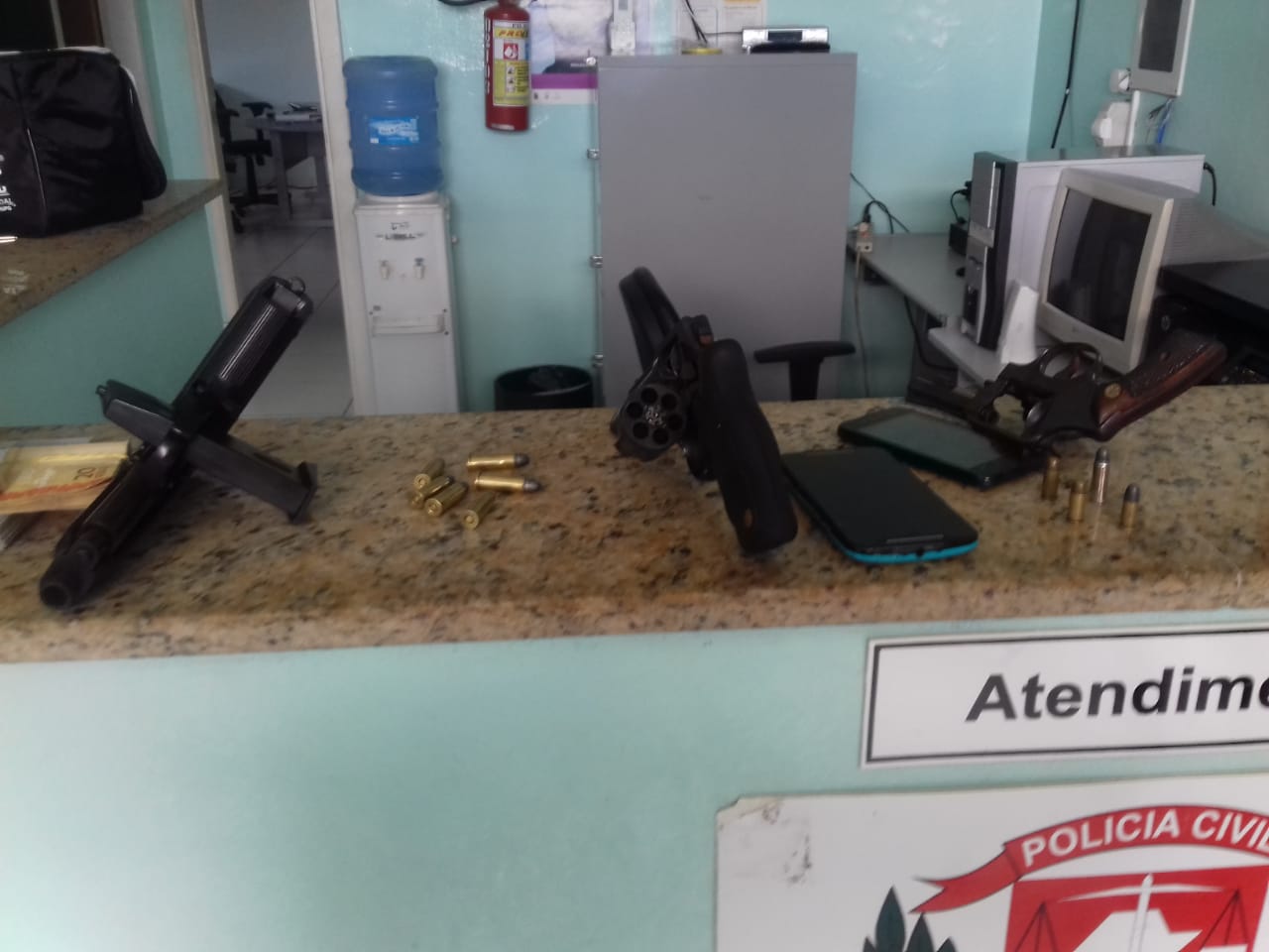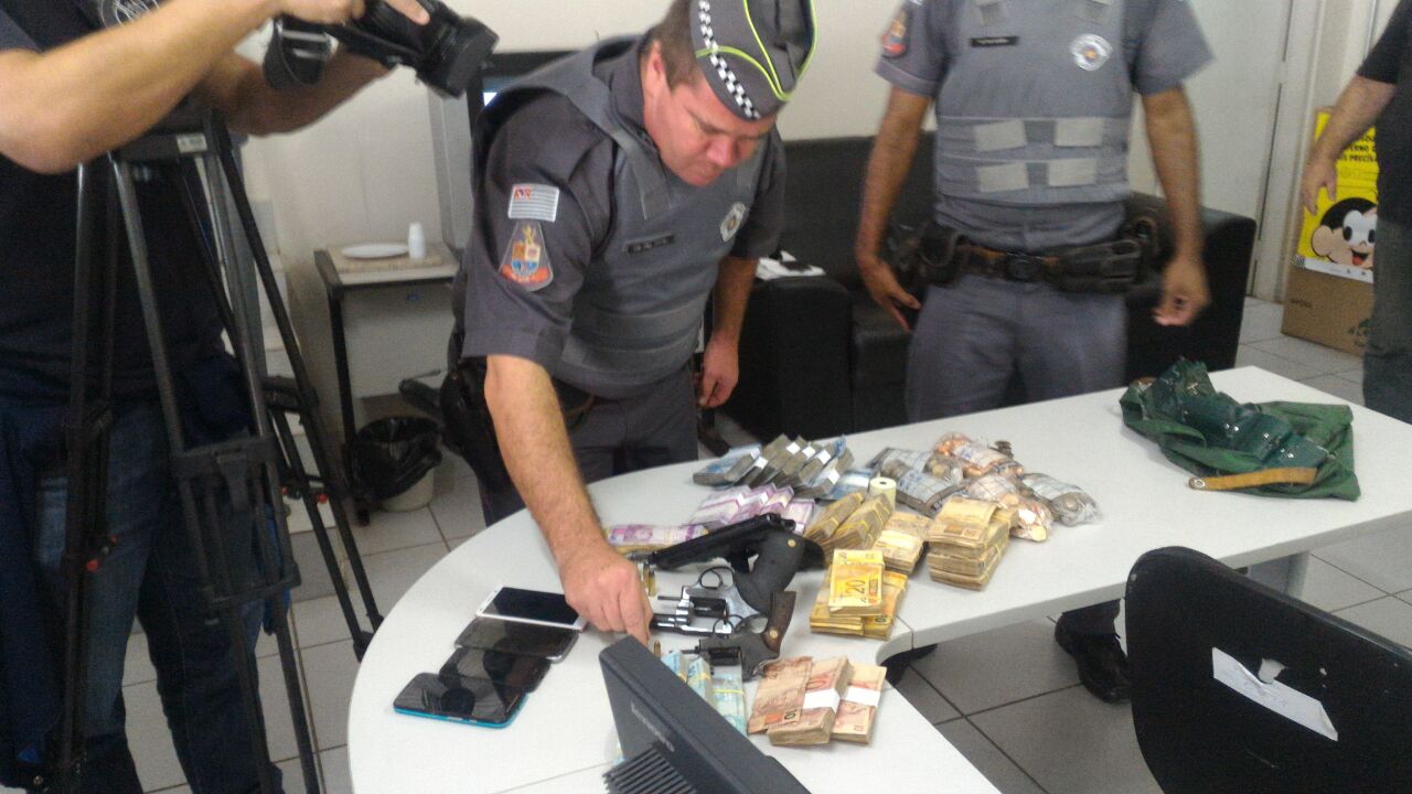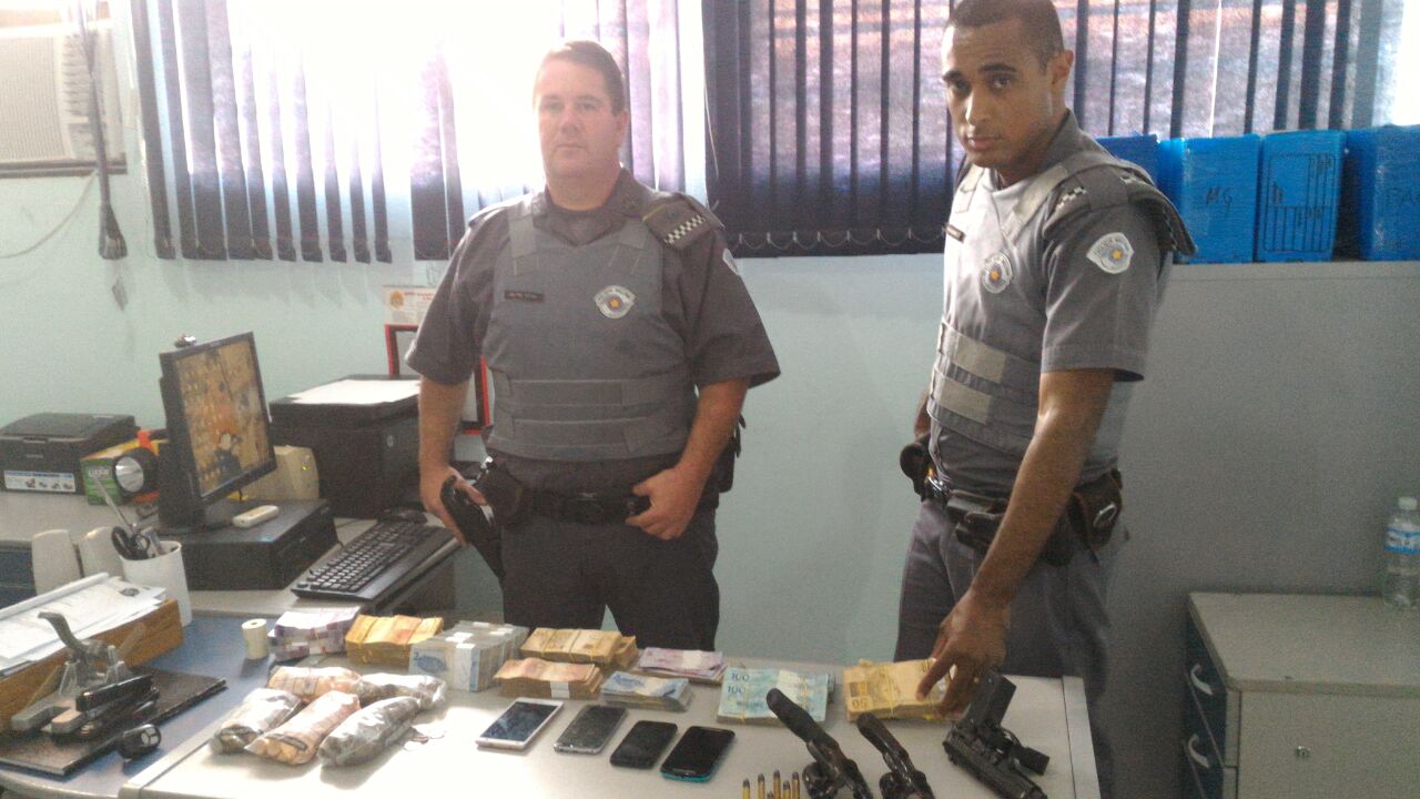 Na busca veicular foram encontrados dois revólveres (um calibre 38, municiado com 06 cartuchos e um calibre 32, municiado com 05 cartuchos – ambos com a numeração suprimida), um simulacro de pistola e um malote contendo muitas notas e moedas. Os homens presos confirmaram o delito e disseram que residem na zona leste de São Paulo.
