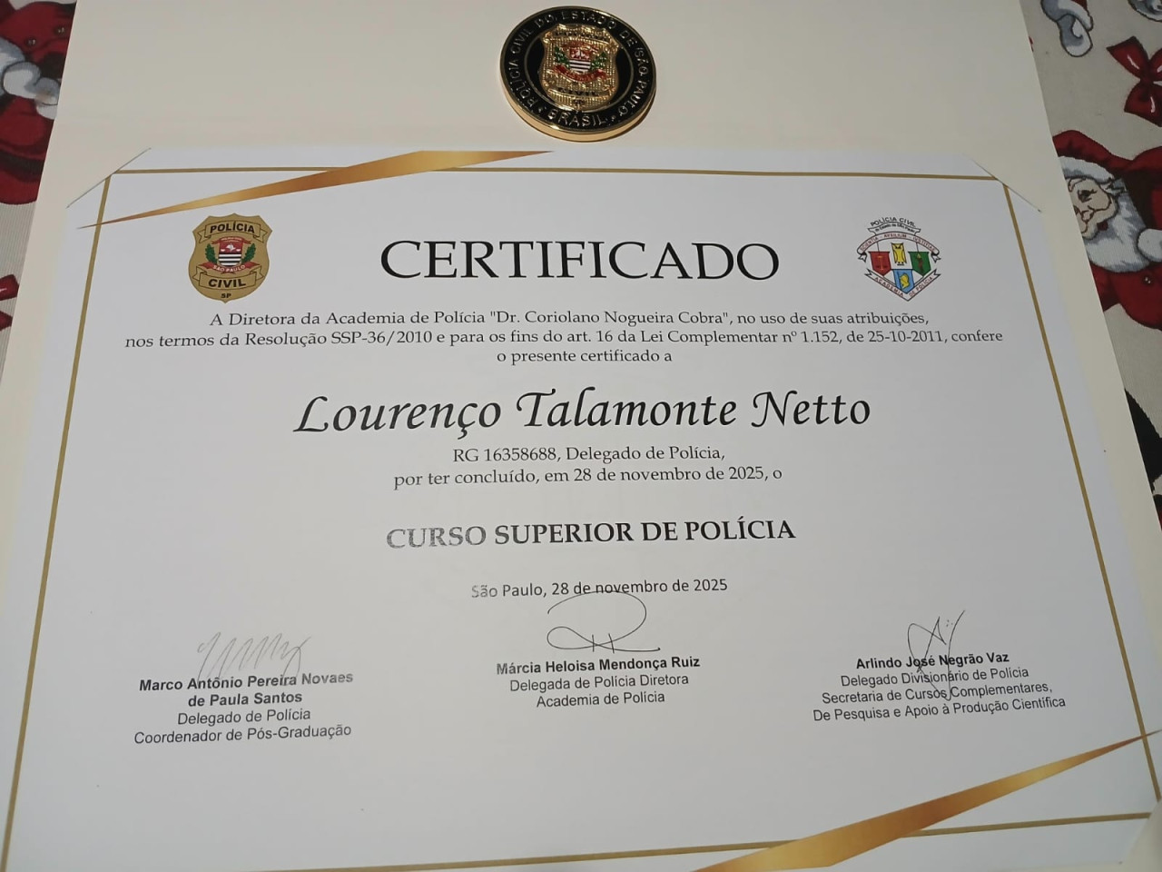 Dr. Lourenço Talamonte Neto, retomou suas atividades nesta segunda-feira após concluir o Curso Superior de Polícia, formação de alto nível destinada ao aperfeiçoamento de oficiais e delegados.