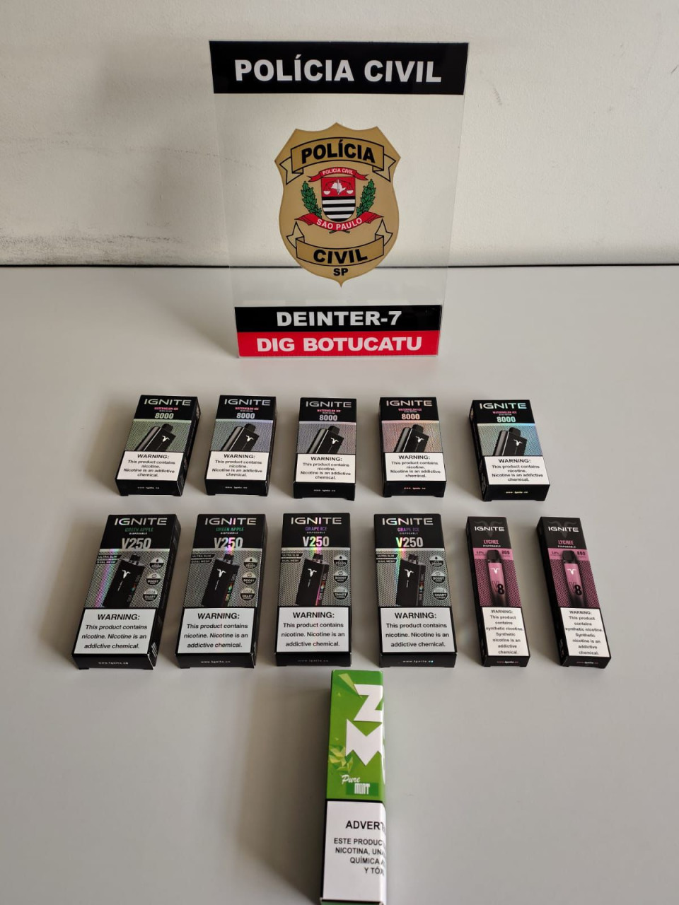 A ação atendeu a uma determinação da Delegacia Seccional de Polícia de Botucatu-SP e resultou na apreensão de 82 cigarros eletrônicos, 188 refis de essência e 22 acessórios diversos destinados ao uso desses dispositivos. Todo o material foi avaliado em mais de R$ 22 mil.