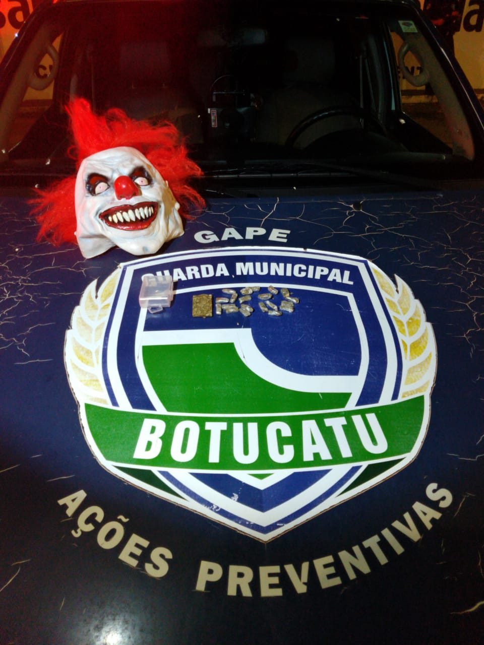 Com os elementos foram encontrados entorpecentes e uma máscara de palhaço usada para as mais diversas situações. Ambos foram presos e levados até o Plantão da Polícia Civil.