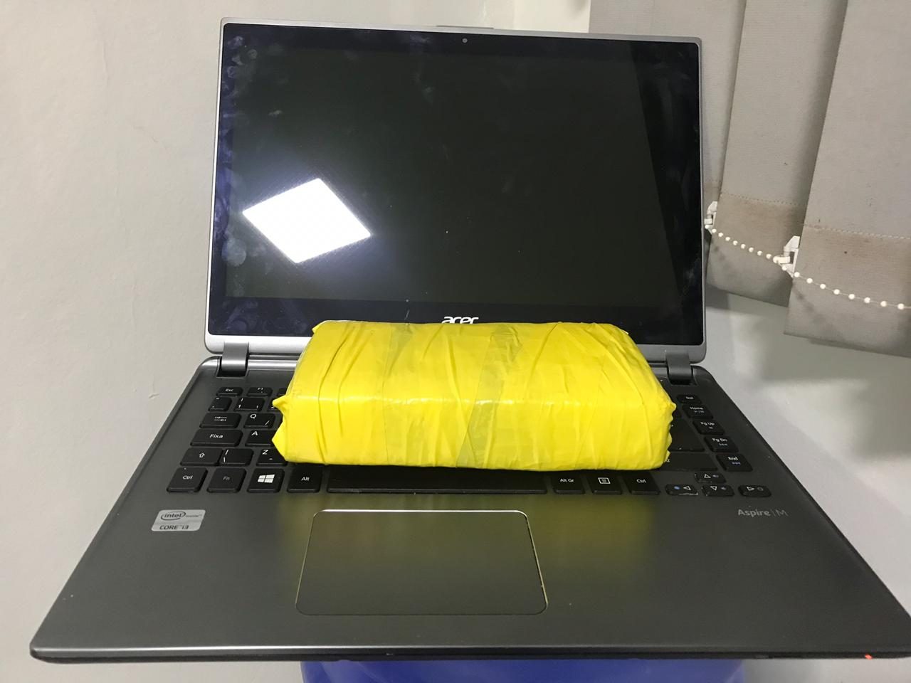 Em busca foi localizado no quarto do indiciado, sob o colchão, um tijolo prensado de maconha e na sala do imóvel, um notebook da marca Acer, produto de furto ocorrido no dia 22 de julho, reconhecido posteriormente pela vítima.