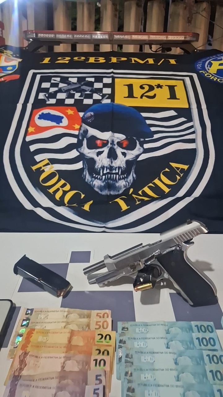 Na vistoria, os policiais apreenderam uma pistola Taurus PT 92 calibre 9 mm, dois carregadores e 34 munições intactas. Também foram localizados três aparelhos celulares e R$ 1.986 em dinheiro. O veículo utilizado na ação foi apreendido.