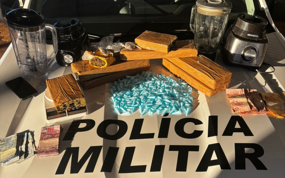 Durante a busca no imóvel, os policiais localizaram uma mochila roxa sobre um guarda-roupa. No interior, foram encontrados cinco tijolos e meio de maconha, além de duas porções da mesma droga já embaladas para venda, 120 pinos de cocaína, R$ 620 em dinheiro, bem como diversos apetrechos utilizados para o preparo e embalo dos entorpecentes.