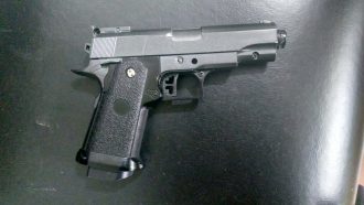 Foi dado ordem para que o mesmo saísse da residência. Após busca pessoal realizada juntamente com apoio da Policia Militar, a avó do jovem, que reside no local, trouxe a mochila do mesmo, no qual junto de seus pertences foi encontrado um SIMULACRO de pistola da cor preta.