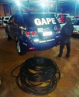 A Guarda Municipal registrou na madrugada desta terça-feira, dia 17, um caso de furto de fiação elétrica. Os GCMs Nogueira, De Santi e Marcos, todos da equipe GAPE (Grupo de Ações Preventivas Especiais), estavam em patrulhamento preventivo pela Rodovia Gastão Dal Farra, próximo ao bairro Cedro, quando avistaram um indivíduo com uma carriola improvisada, feita de estrutura de geladeira em atitude suspeita ao lado de um poste de energia pública.