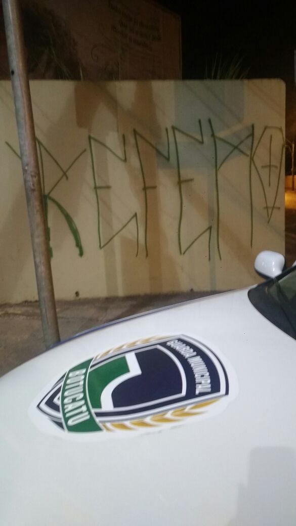 Passadas as características, o suspeito foi avistado próximo à Praça Anita Garibaldi. Ele tinha em uma das mãos uma lata de spray de tinta. Feita a abordagem e ao ser indagado sobre a pichação, o mesmo confessou que tinha acabado pichar “REFEN” e no final desenhou um caixão virado ao contrário.