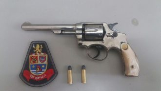 Após o roubo, os policiais CB FELIPE, SD Mariotti e SD Soldado, como apoio da viatura composta pelos policiais CB Escorsi e SD Maian, localizaram a moto roubada com sinais de queda no canteiro de uma rotaria da Castelo Branco. Ela estava ao de um revolver cal. 38, com 2 munições intactas.