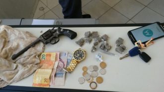 Durante a abordagem, um dos ocupantes iniciou fuga pela via, entrou no matagal sentido Vila Ema e conseguiu se evadir. Os outros dois foram contidos e abordados. Na busca veicular, foram encontrados um revólver calibre 32 com a numeração suprimida e o valor R$ 42,00. Também foram localizadas 16 porções de maconha e um cigarro de maconha.