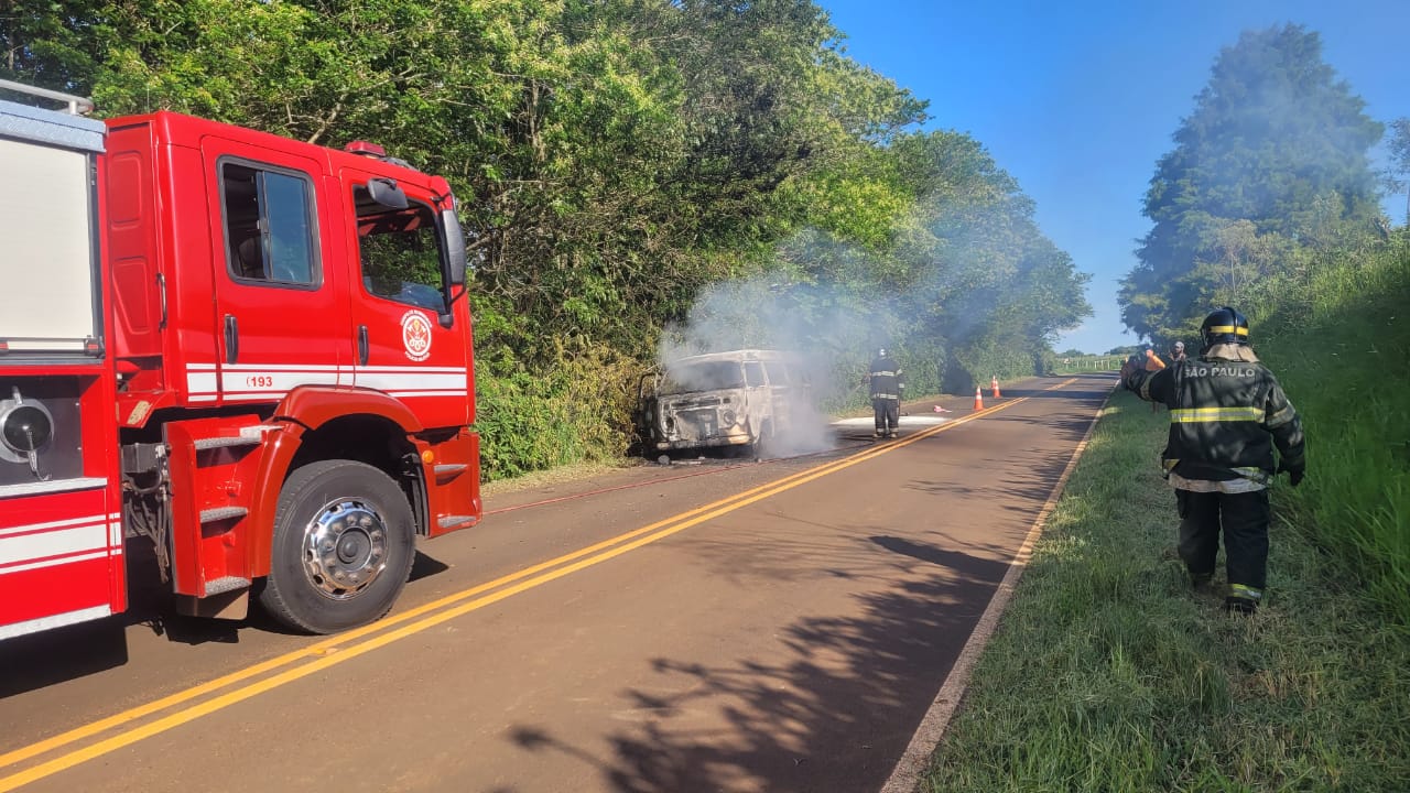 Uma Volkswagen Kombi, de cor branca, foi destruída pelas chamas, mas com a chegada da equipe no local, o incêndio foi extinto. Veículo foi retirado da rodovia e colocado no acostamento.