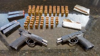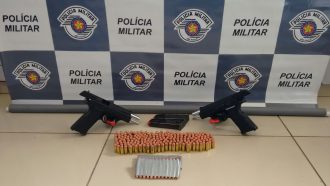 Com a mulher os policiais conseguiram localizar 2 pistolas 9 mm, 4 carregadores, 192 munições de pistolas .40 e 50 munições do calibre 9 mm.