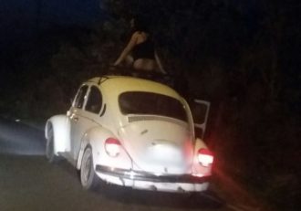 Uma cena no mínimo inusitada, mas também uma ação perigosa e contra as leis de trânsito, além de desrespeitosa. Um morador flagrou na noite desta quinta-feira, dia 07, uma mulher, seminua, aparentemente embriagada, em cima de um VW Fusca.