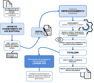 “Com a decisão de novas eleições, o cartório eleitoral deverá reprocessar os votos da eleição ordinária no sistema de totalização (Gerenciamento) de forma a constar a nulidade dos votos para o candidato. Para isso, deverá antes de tudo, fazer a atualização da situação dos candidatos envolvidos no Sistema de Candidaturas – CAND (prefeito e vice) imprimindo o relatório Histórico de Julgamento. Em seguida, tratando-se do candidato mais votado, é necessário fazer um RDJ: registro de decisão judicial, que consiste em alterar a destinação dos votos conforme a decisão do juiz eleitoral a respeito da validade dos votos”, informou a Justiça Eleitoral.