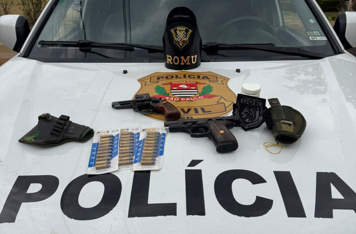 Ao ser questionado, o morador informou que as armas de fogo que possuía estavam guardadas em outro endereço, no bairro Parque Laguna. As equipes se deslocaram até o imóvel indicado e localizaram uma pistola calibre .380, um revólver calibre .38 e munições de diversos calibres, todos sem o devido registro.