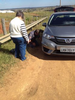 Depois de uma breve conversa, a condutora do veículo informou que teria perdido o controle do seu carro e caído em uma canaleta lateral da pista, o que acabou fazendo com que o pneu dianteiro do seu veículo estourasse, impossibilitando a mesma de seguir viagem. Imediatamente os policiais se ofereceram para realizar a troca do pneu, auxílio esse que a condutora aceitou, visto que não conseguiria realizar a troca sozinha.
