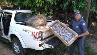 Em Operação Semana Santa e durante patrulhamento preventivo nas margens do Rio Tietê, Bairro Benjamin, município de São Manuel, uma equipe da Polícia Ambiental de Botucatu, ao efetuar vistoria nos barracos no vilarejo, encontrou em um quintal do lote, quatro caixas de isopor contendo nelas 40 quilos de pescado (lambaris), sem barrigada, além de 12 redes de nylon, malhas 18mm, com 30 mts de comprimento cada. As redes estavam entrelaçadas, totalizando 360 metros de redes usadas para a captura dos peixes.