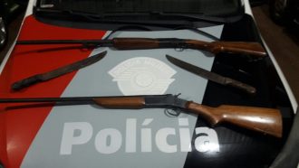 Ao perceberem a viatura tentaram fugir, porém, sem êxito. De imediato foi solicitada a parada e ordenado que os ocupantes saíssem do veículo. Durante busca pessoal, nada de ilícito foi encontrado. Já na vistoria do veículo, foram localizadas duas armas de fogo e dois facões, objetos que eram utilizados nos roubos e furtos pela região.