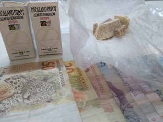 Em sua posse foi localizado o valor de R$ 119 em diversas notas. O embrulho arremessado foi recuperado e nele continha aproximadamente 40g de crack em várias pedras brutas, que ainda seriam fracionadas e embaladas para a venda.
